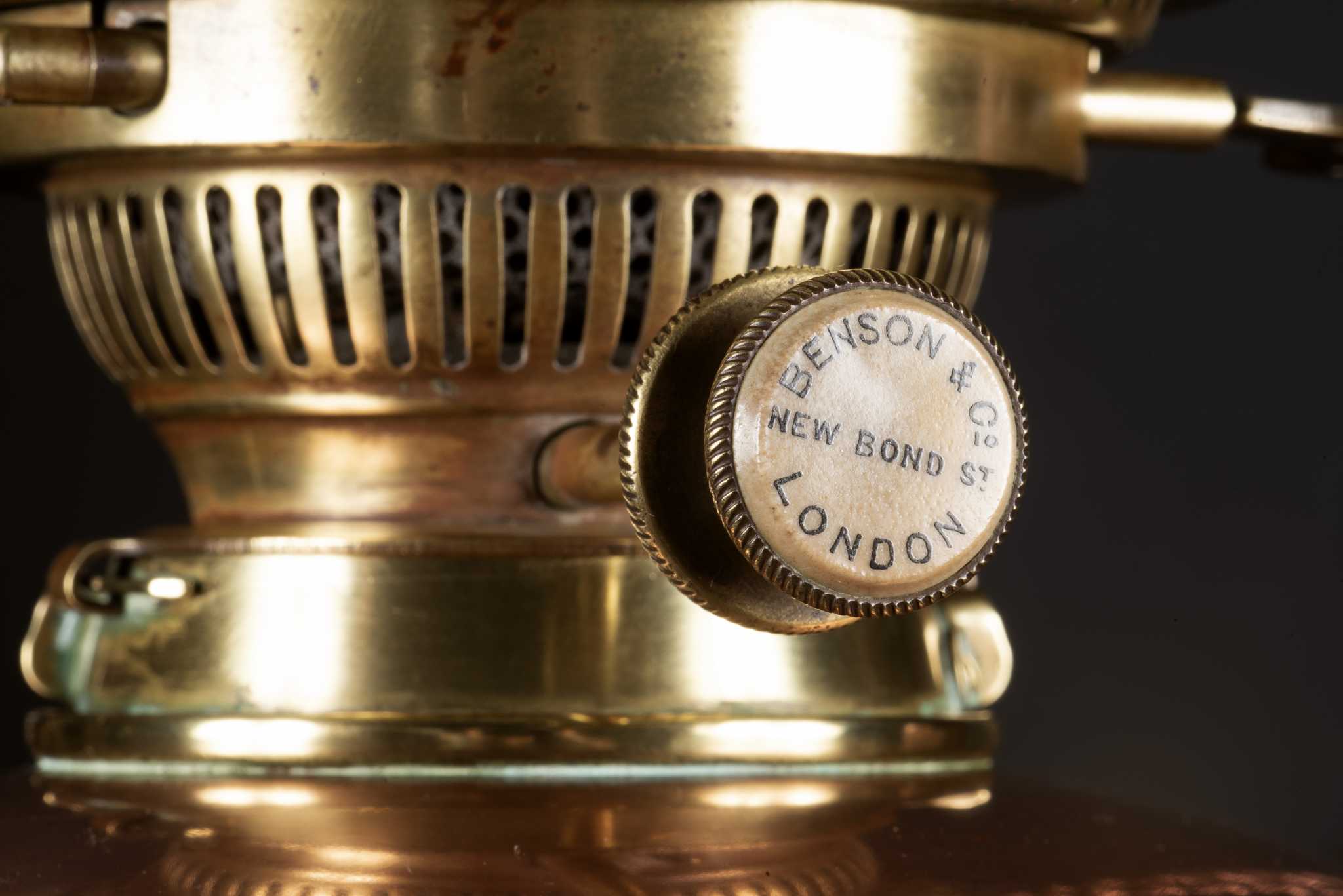 Suspension en cuivre et laiton par Willam Arthur Smith Benson. Modèle No 86 Pour W.a.s. Benson & Co Estampille « BENSON » présente sous la cloche. Bruleur de marque « Benson and Co » Londres 1900