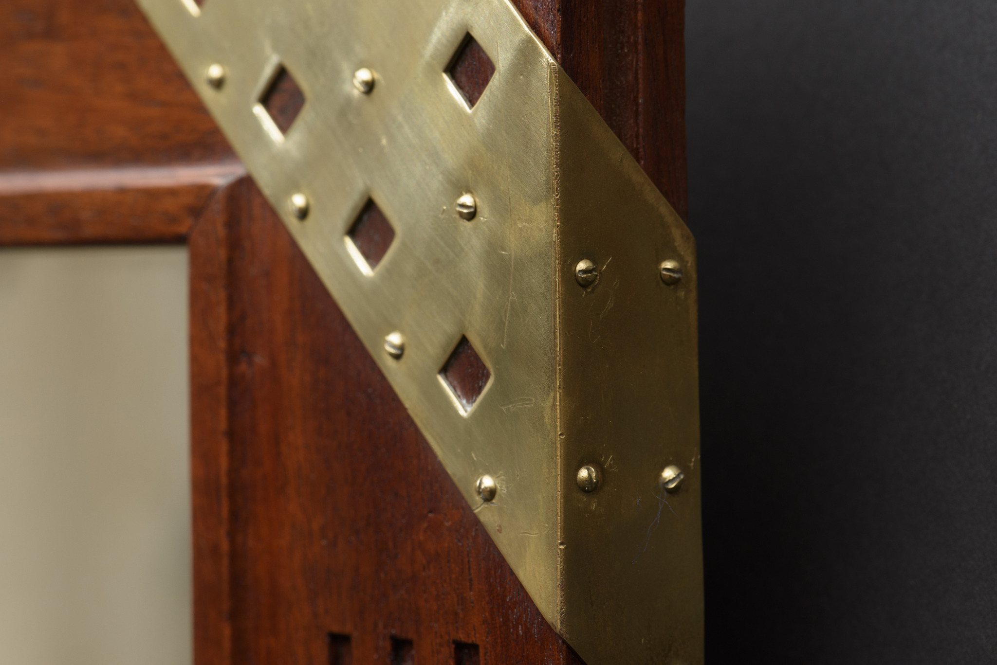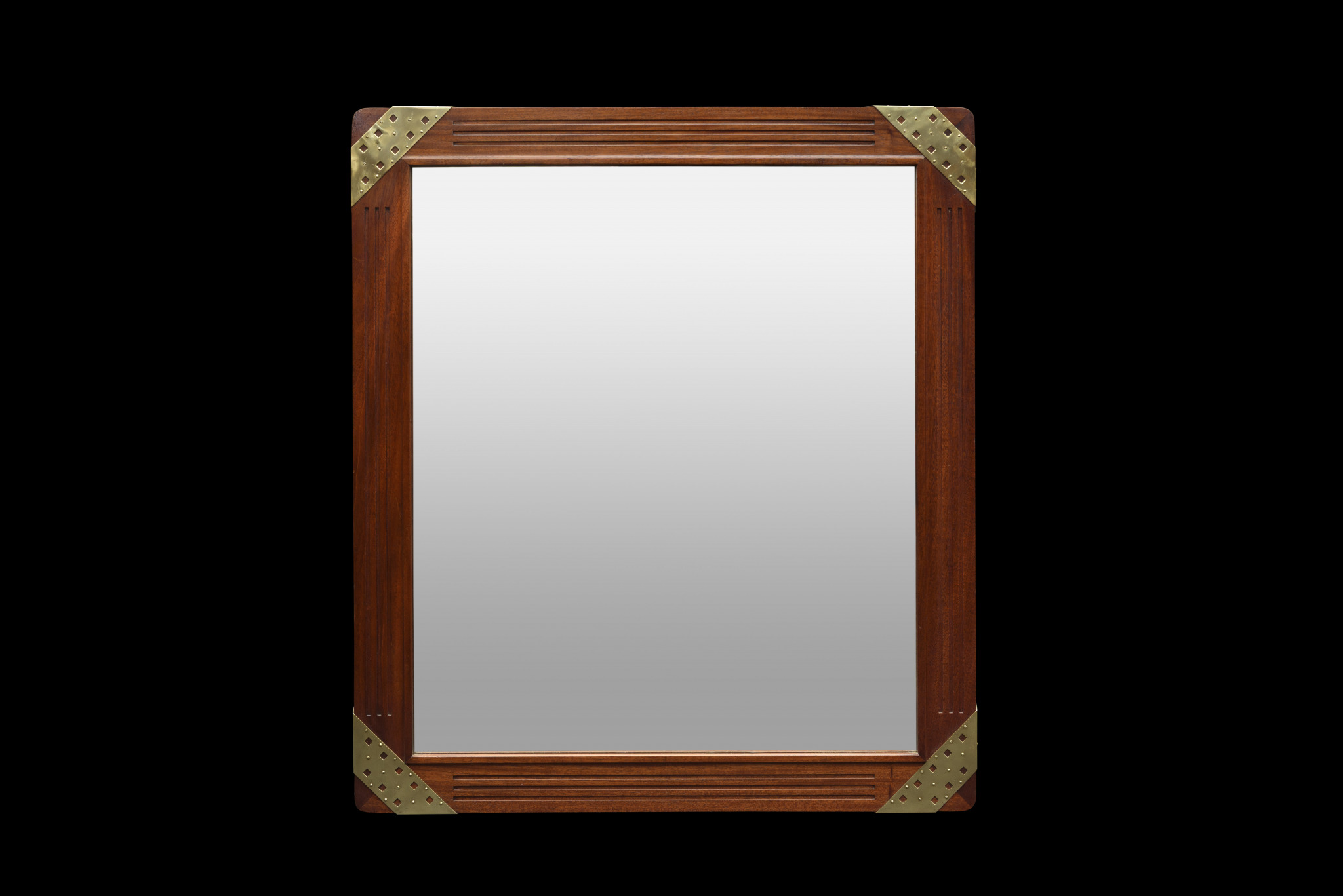 Miroir en padouck rainuré et bandeaux d’angle en laiton.
