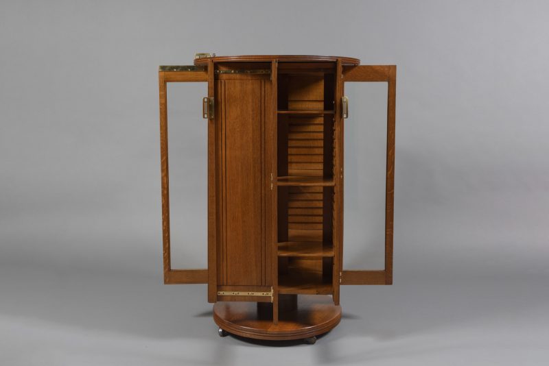 Bibliothèque tournante en chêne et quincailleries en laiton. Ce modèle, inspiré des productions britanniques, était disponible à la vente en chêne, en acajou ou en noyer. H 115 × L 62 × P 62 cm c.1904