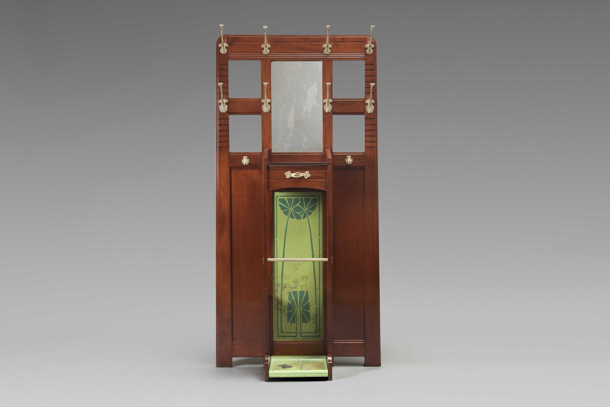 Acajou, laiton, zinc peint et pochoirs aux feuilles de marronnier vert moyen sur vert claire H 198 x L 95,5 cm c.1903 Provenance: Collection particulière Bruxelles