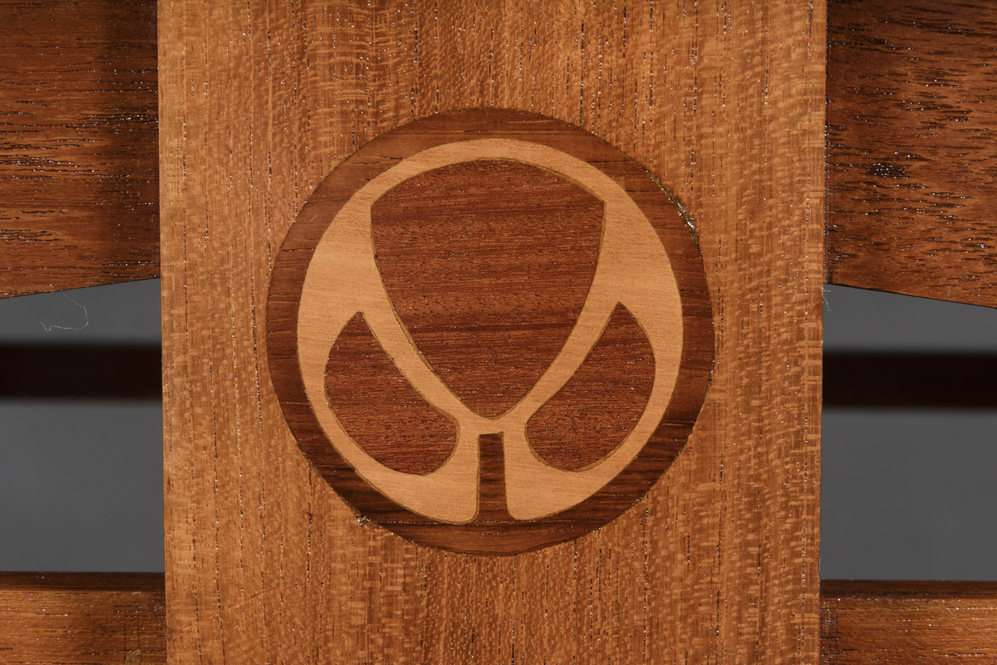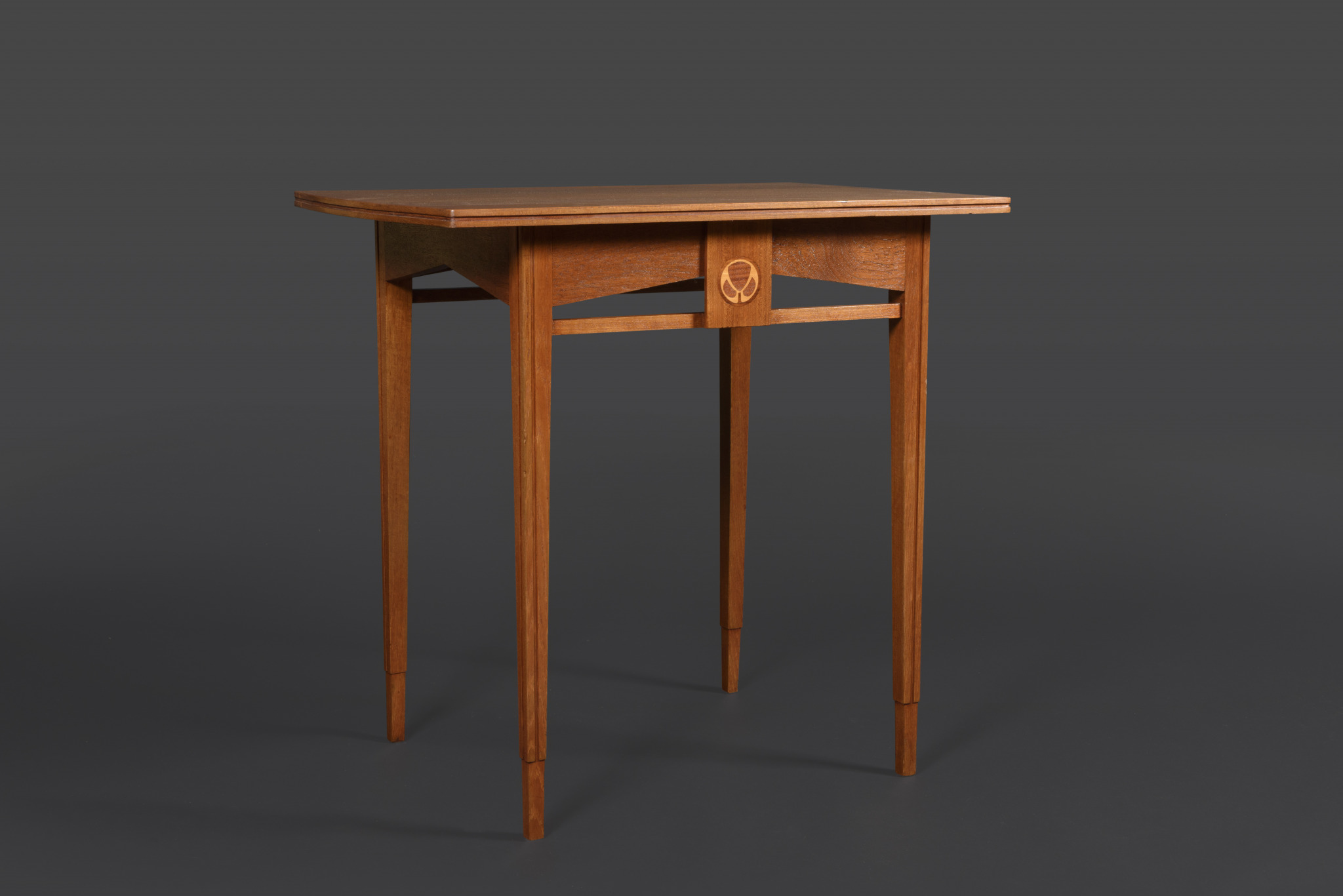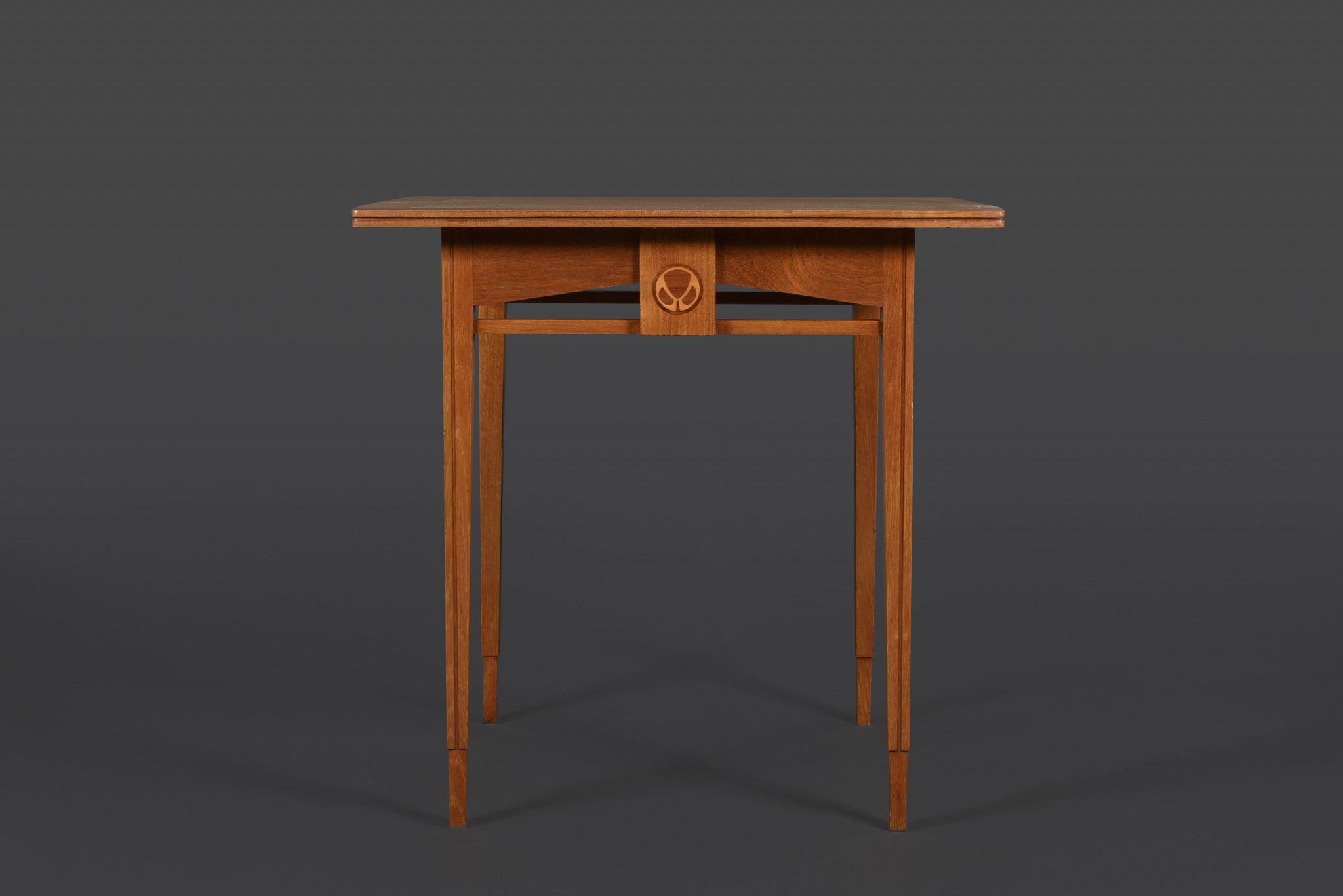 Gustave Serrurier-Bovy (1858-1910) « Serrurier & Cie » Table d’appoint de la série « Magniolia » Teck Marqueterie de sycomore, palissandre et acajou C. 1906 H: 75 cm L :78cm P : 54 cm